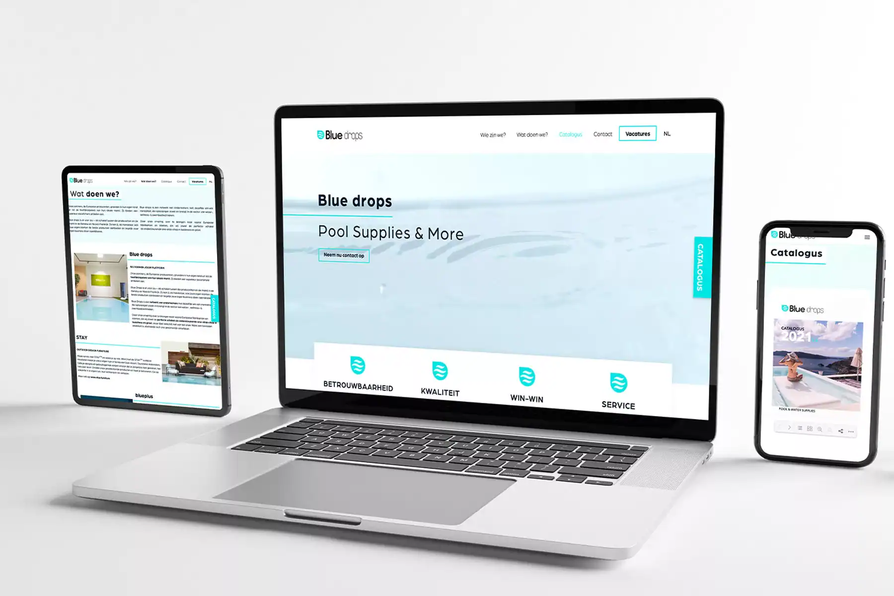 Voor Blue drops sloeg ons team in 2016 de handen in elkaar voor de uitwerking van het volledige concept. Startende met een leuke merknaam, logo en baseline. Vervolgens gingen we aan de slag om een catalogus, flyers en verkoopmappen te ontwerpen. We zorgden uiteraard voor een website in hetzelfde plaatje. In 2021 was de site aan vernieuwing toe, dus zorgde ons team voor een rebranding met ook de nodige functionele upgrades.